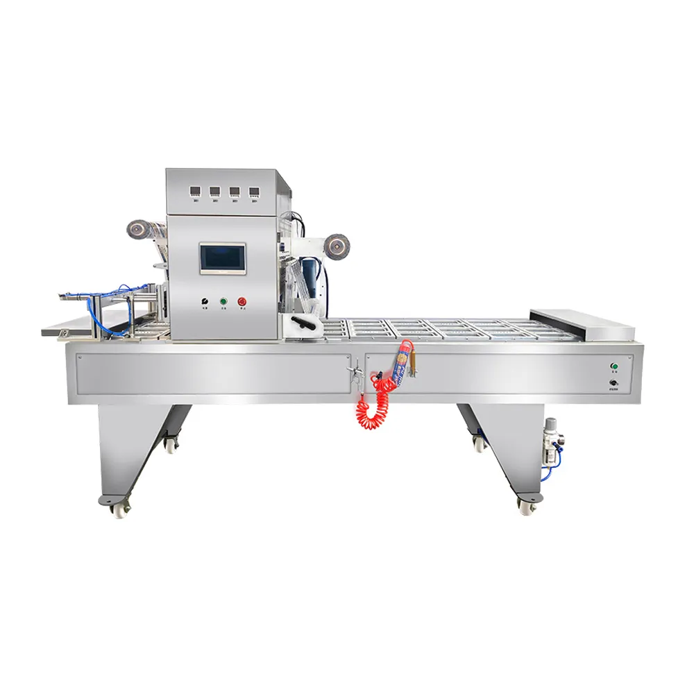 — это высокопроизводительное оборудование для герметичной упаковки пищевых продуктов в готовые лотки (контейнеры) из пластика или алюминия. Аппарат последовательно удаляет воздух из упаковки, замещает его инертным газом (азотом или смесью), термосваривает многослойную плёнку и обрезает её точно по контуру. Расширенная ширина рабочей пленки (до 750 мм) позволяет обрабатывать крупногабаритные лотки и одновременно несколько небольших контейнеров, что делает модель оптимальным выбором для производств с высоким объёмом выпуска.