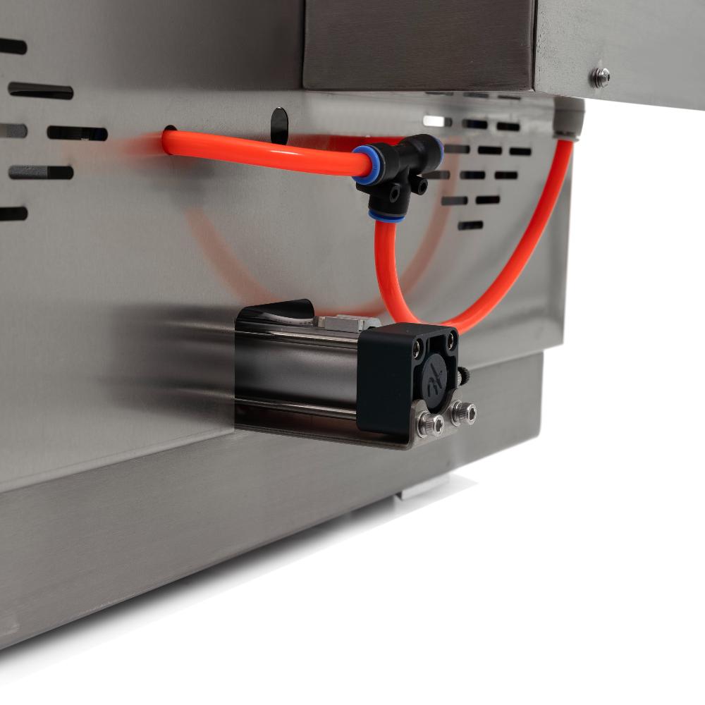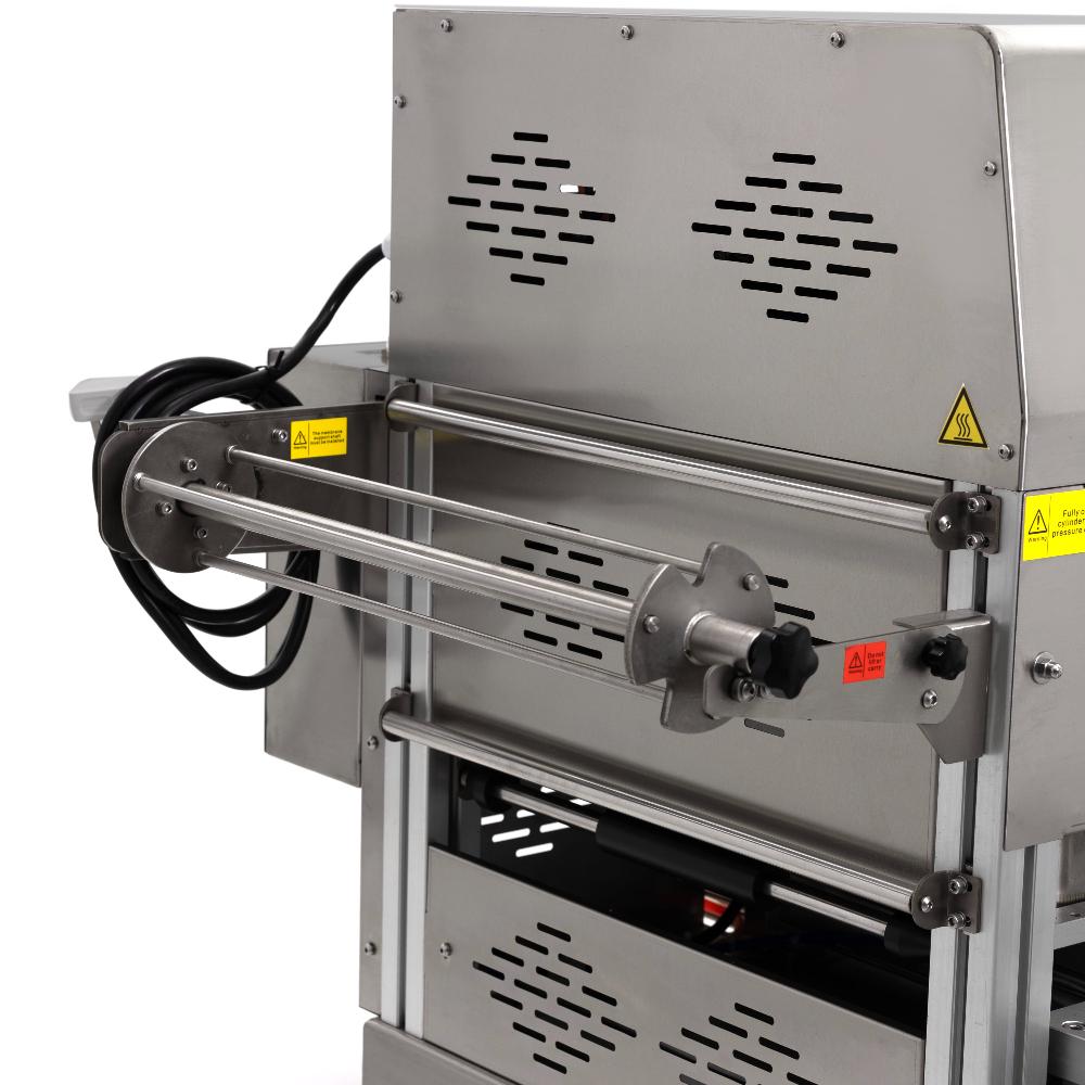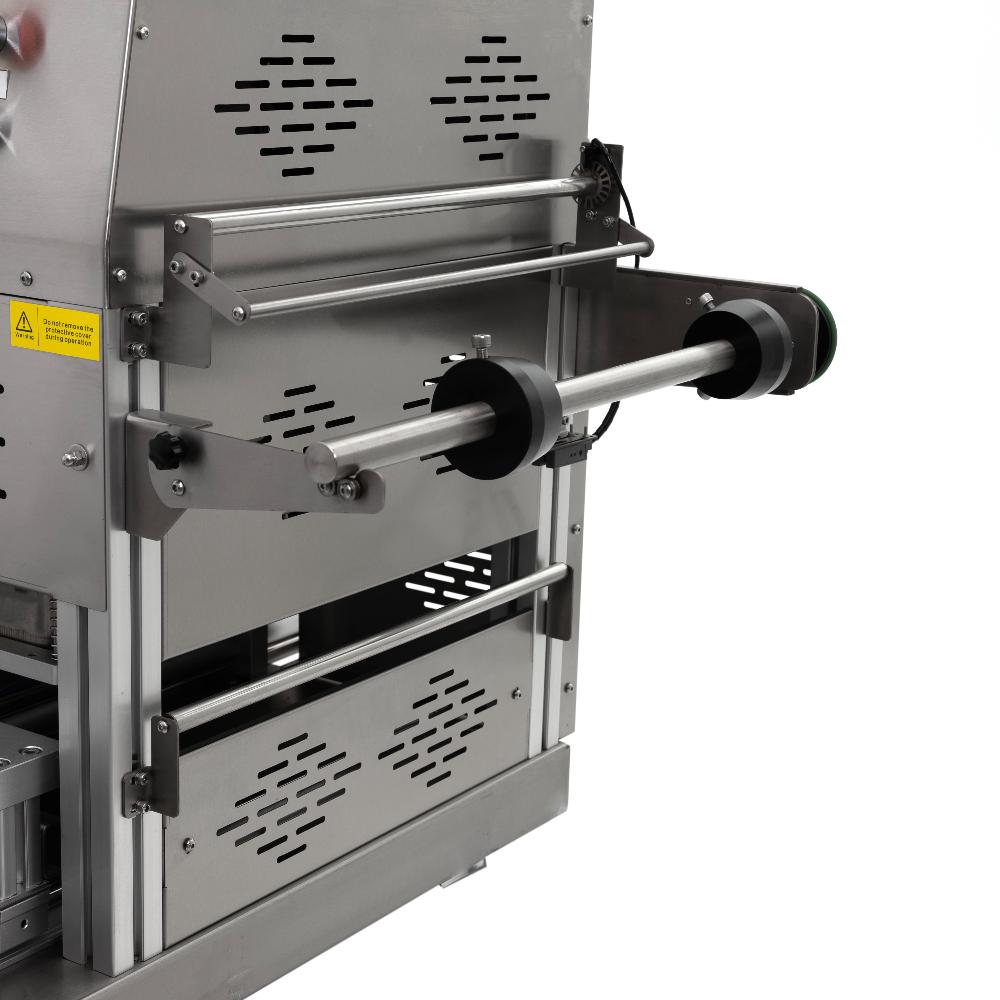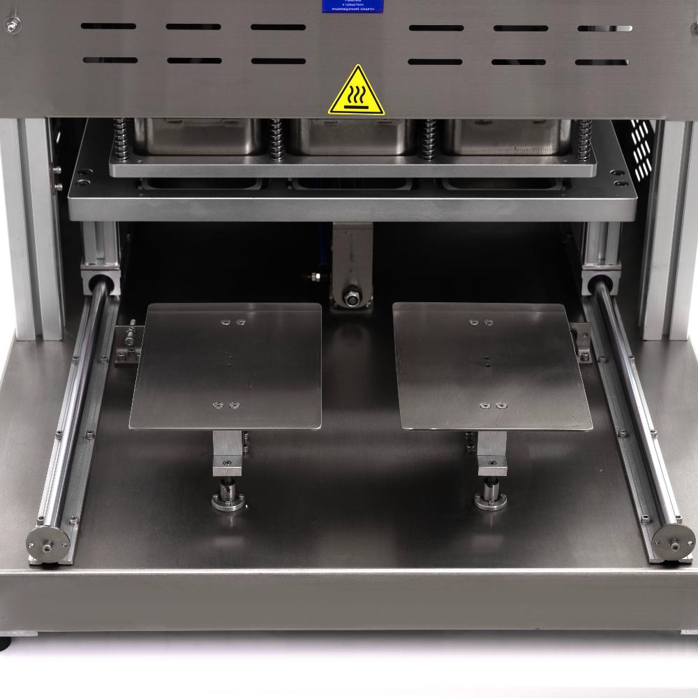 - Эффективная термосварка с обрезкой по контуру – нагревательный элемент мощностью 3,5 кВт обеспечивает равномерный прогрев и герметичное соединение многослойной пленки с бортом лотка по всей площади, а встроенный механизм одновременно обрезает излишки точно по контуру, формируя эстетичный товарный вид упаковки.