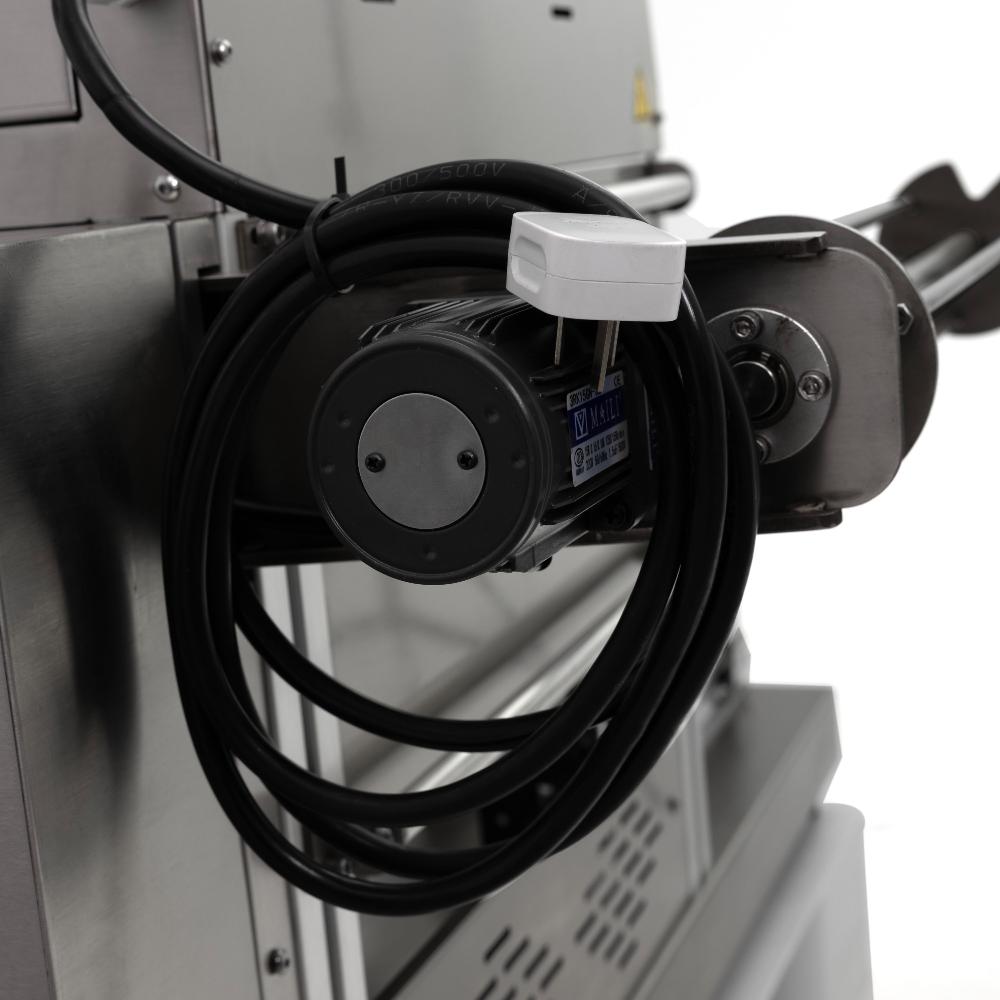 - Надежная конструкция для интенсивной эксплуатации – кожух и контактирующие с продуктом узлы выполнены из нержавеющей стали, устойчивой к коррозии и воздействию моющих средств. Напольное исполнение с габаритами 1350×1210×800 мм обеспечивает устойчивость при работе на упаковочных линиях.