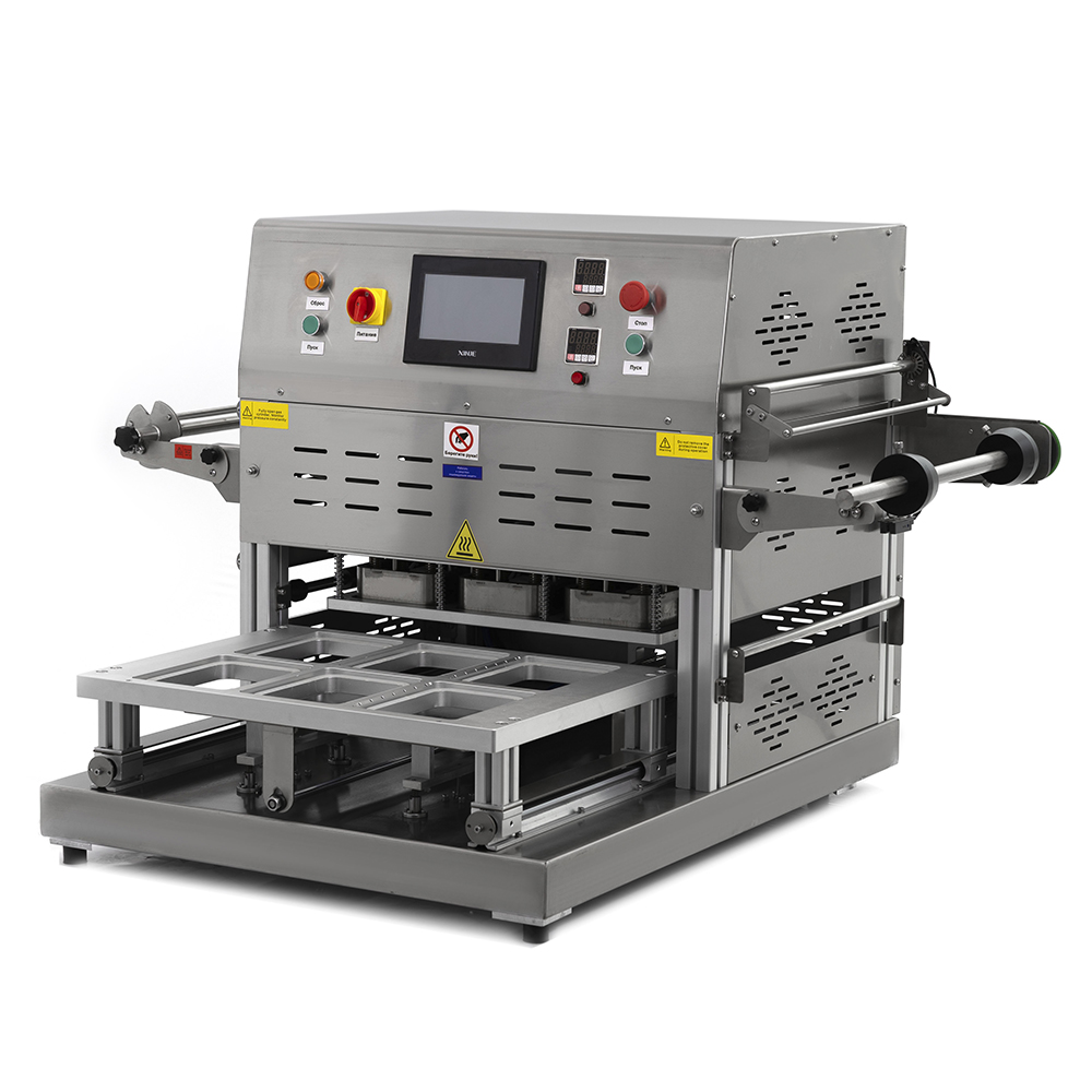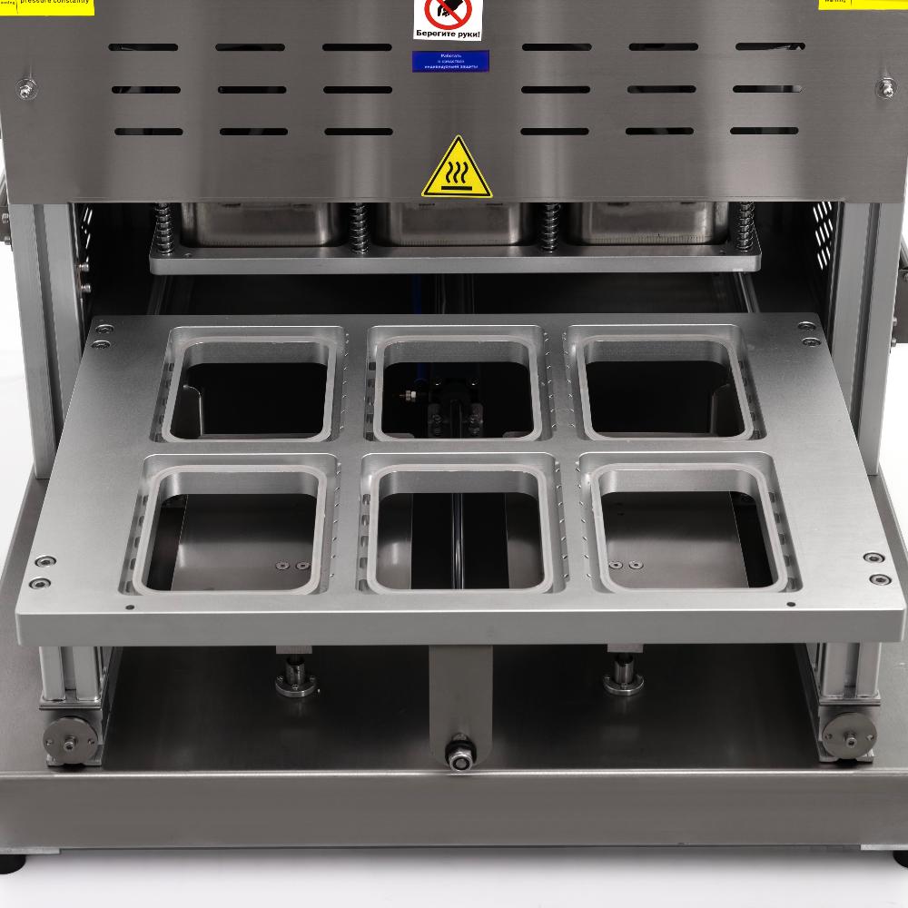- Высокая производительность и полная автоматизация – аппарат обрабатывает до 700 лотков в час, причем движение матрицы с лотками происходит автоматически по одному нажатию кнопки, что гарантирует бесперебойную работу на интенсивном производстве.