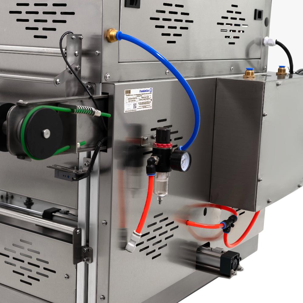 Запайщик лотков с газозамещением и обрезкой по контуру FA-450 Foodatlas – это полуавтоматический напольный аппарат для герметичной упаковки пищевых продуктов в готовые контейнеры из пластика или алюминия. Оборудование выполняет полный технологический цикл: удаляет воздух из упаковки с помощью вакуумного насоса, замещает его инертным газом, термосваривает многослойную пленку и обрезает её точно по контуру лотка.