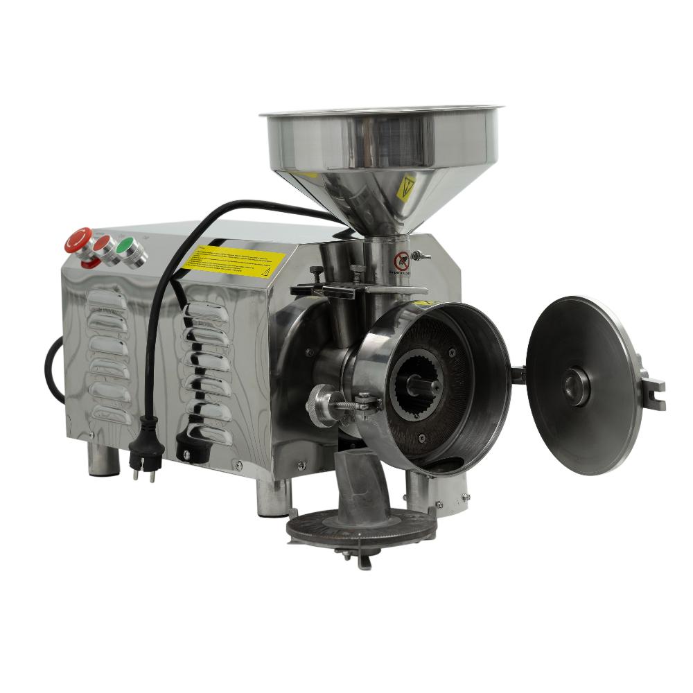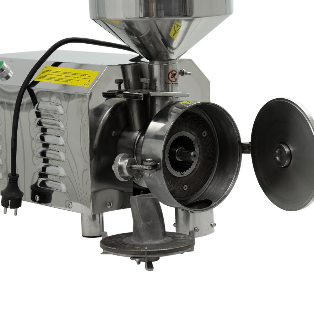 — это профессиональное оборудование для тонкого помола сухих сыпучих продуктов с влажностью не более 35%: пшеницы, ржи, кукурузы, гречки, риса, гороха, нута, сои, кофе, специй, сушёных ягод и других зерновых культур. Модель предназначена для использования на крупных предприятиях пищевой промышленности, в пекарнях, ресторанах и цехах общественного питания. Мощный двигатель 3000 Вт и чугунные жернова обеспечивают производительность до 50-60 кг/ч, а получаемая мука соответствует всем стандартам качества и подходит для выпечки хлеба и хлебобулочных изделий. Корпус и приёмный бункер выполнены из нержавеющей стали с применением технологий хромирования и окрашивания, что гарантирует гигиеничность и долговечность даже при интенсивной эксплуатации.